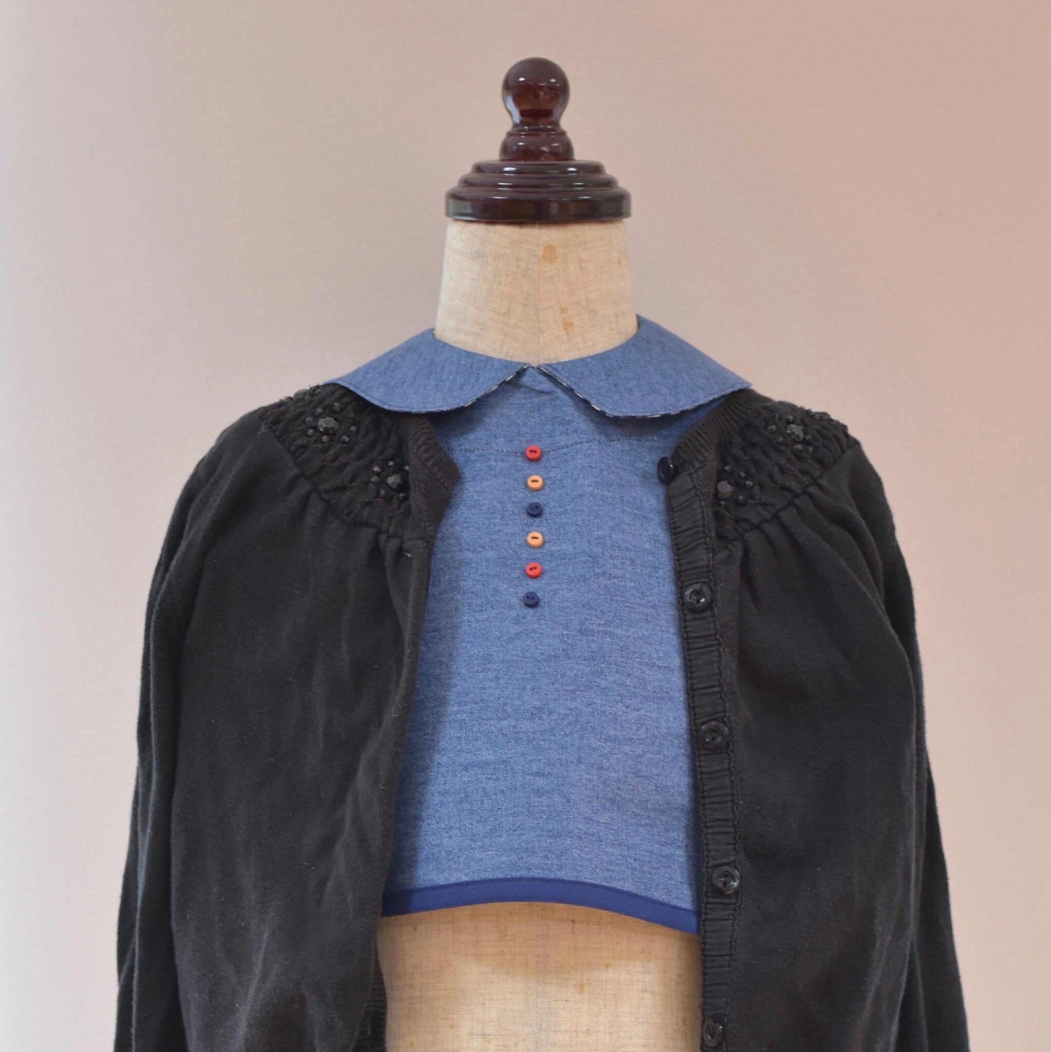 襟付きなので、カーディガンの中などに着ればシャツを着ているように見えるデザインです。